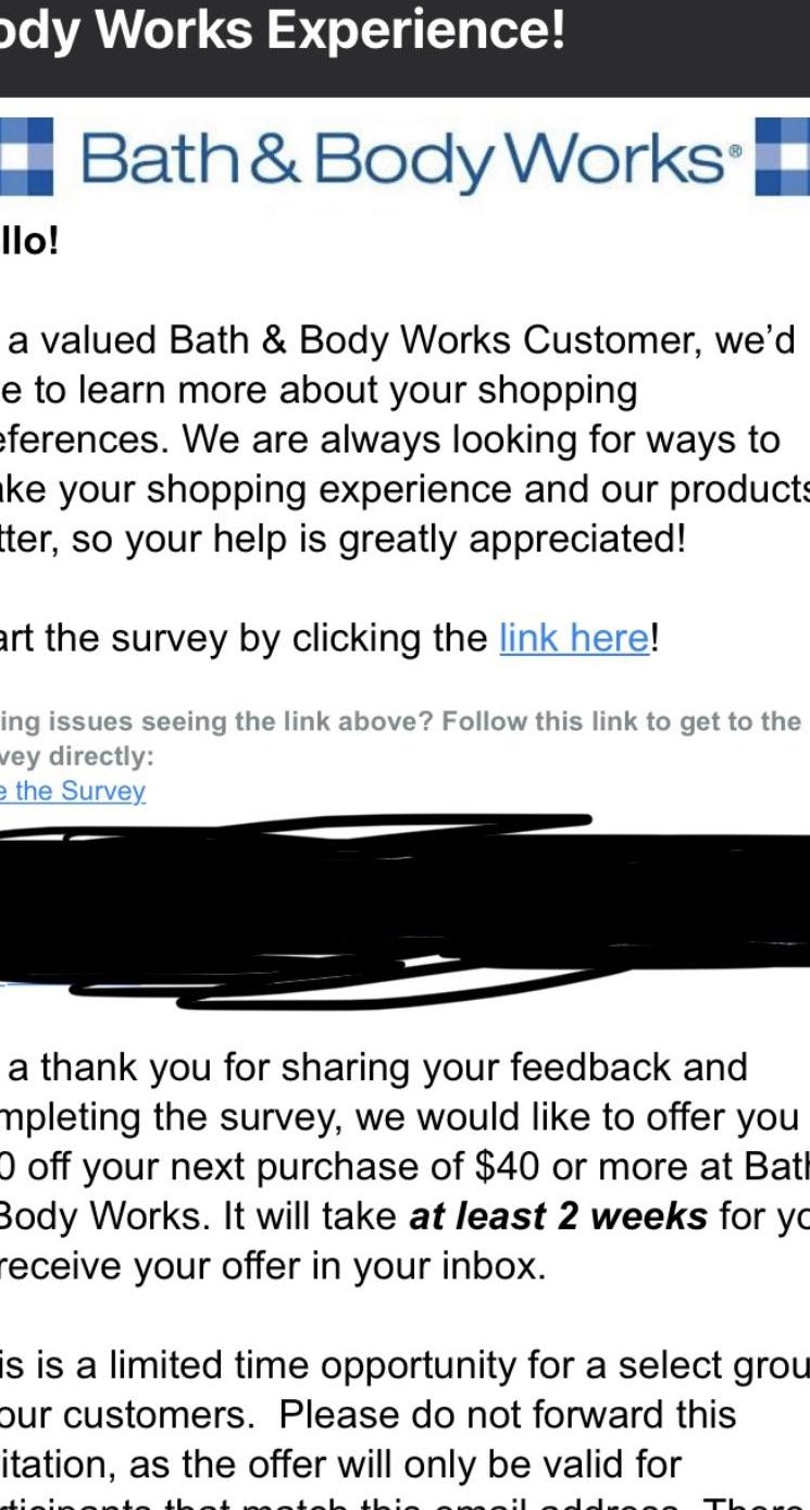 | Survey Method | bathandbodyworks.comThen Develop Account |