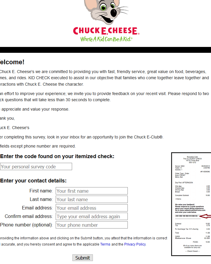 How to enter to participate in the Chuck E. Cheese guest survey on www.chuckecheese.com