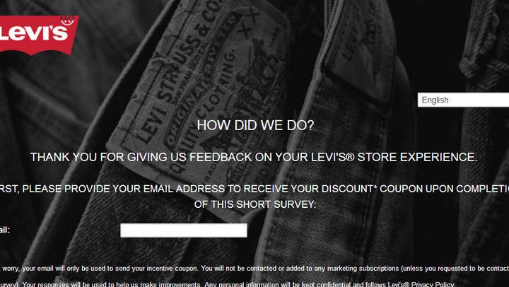 Send your feedback online via Levi Strauss & Co. customer survey at Mylevisexperience.com If you’d like to be awarded an award 20% Off Coupon.