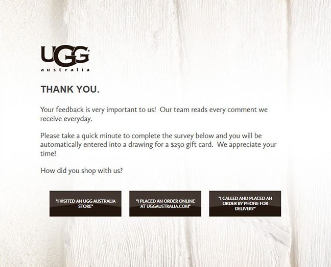Take a look here UGG Customer Survey on www.UGGlistens.com and stand an opportunity to win UGG $250 Gift Card when completion of the survey. Online surveys are an important part of their marketing strategy.